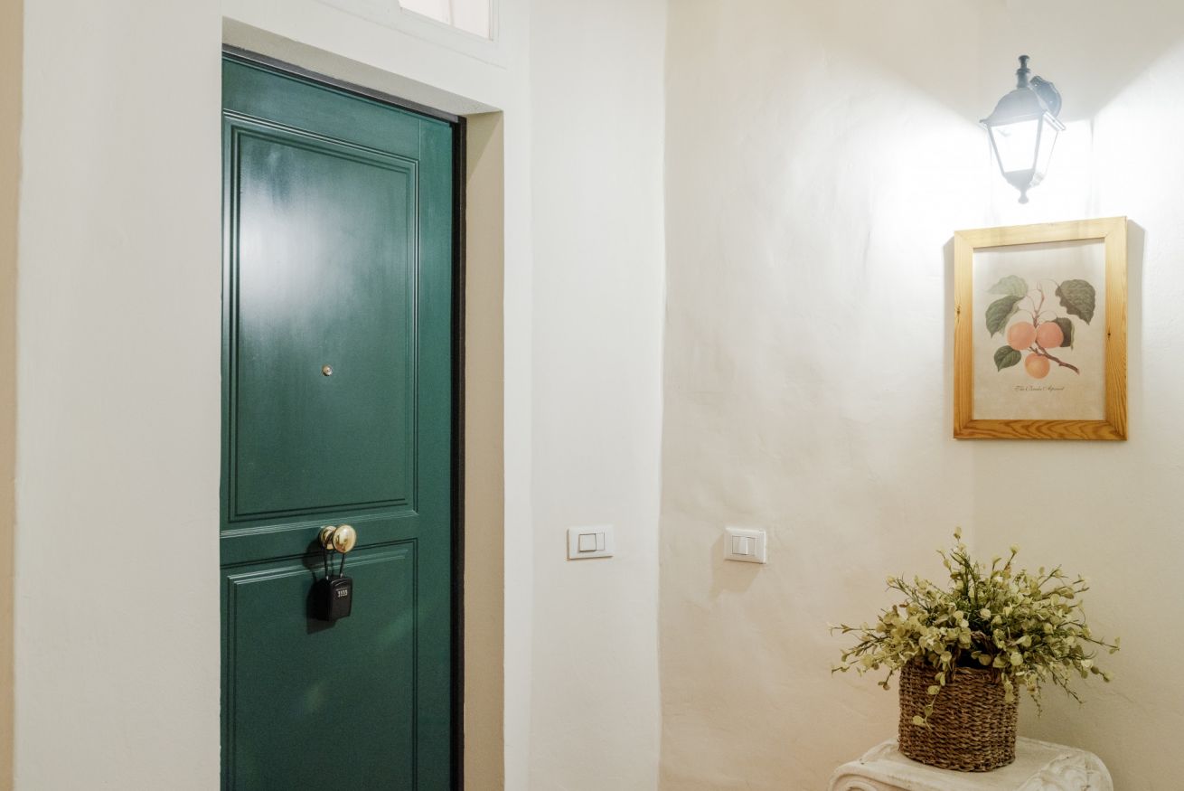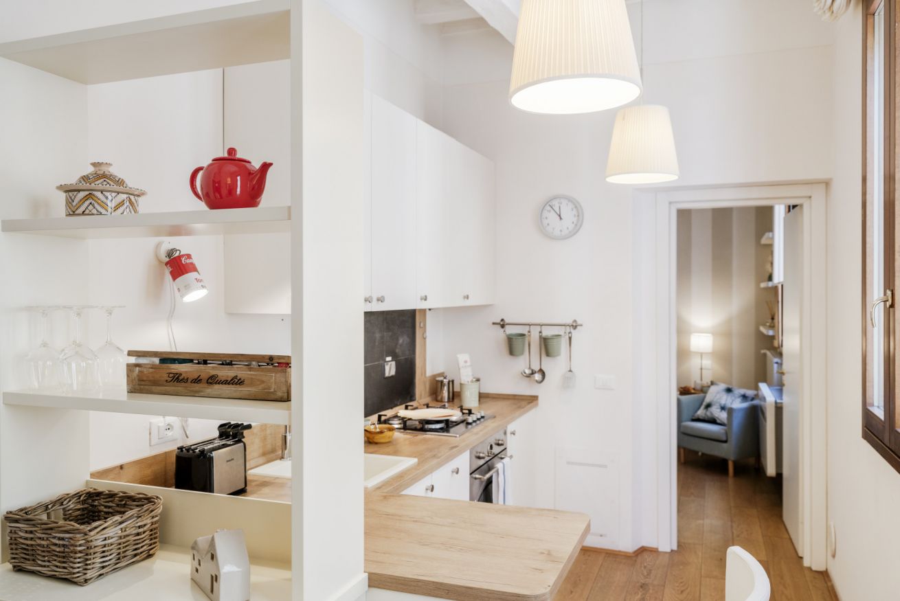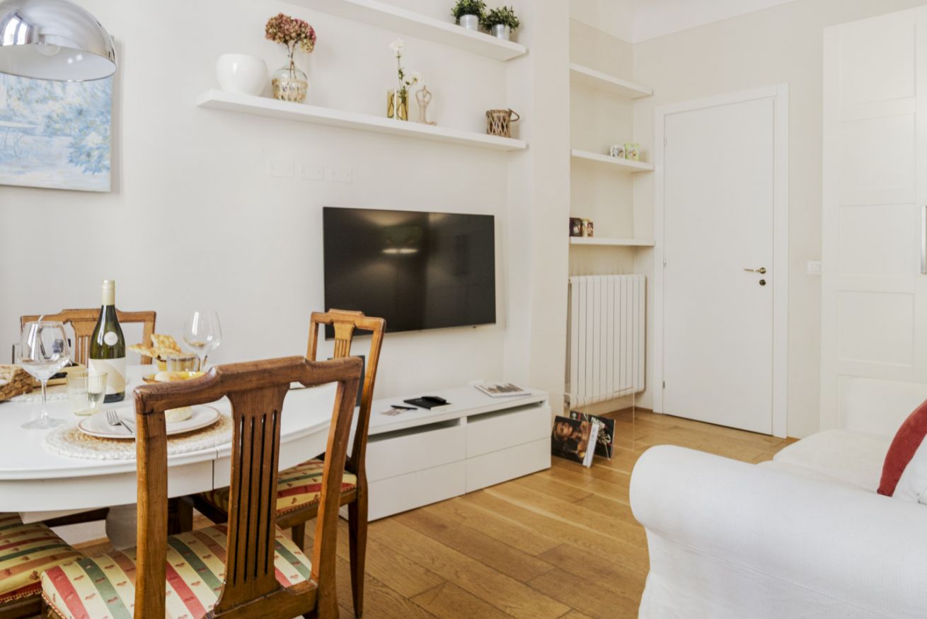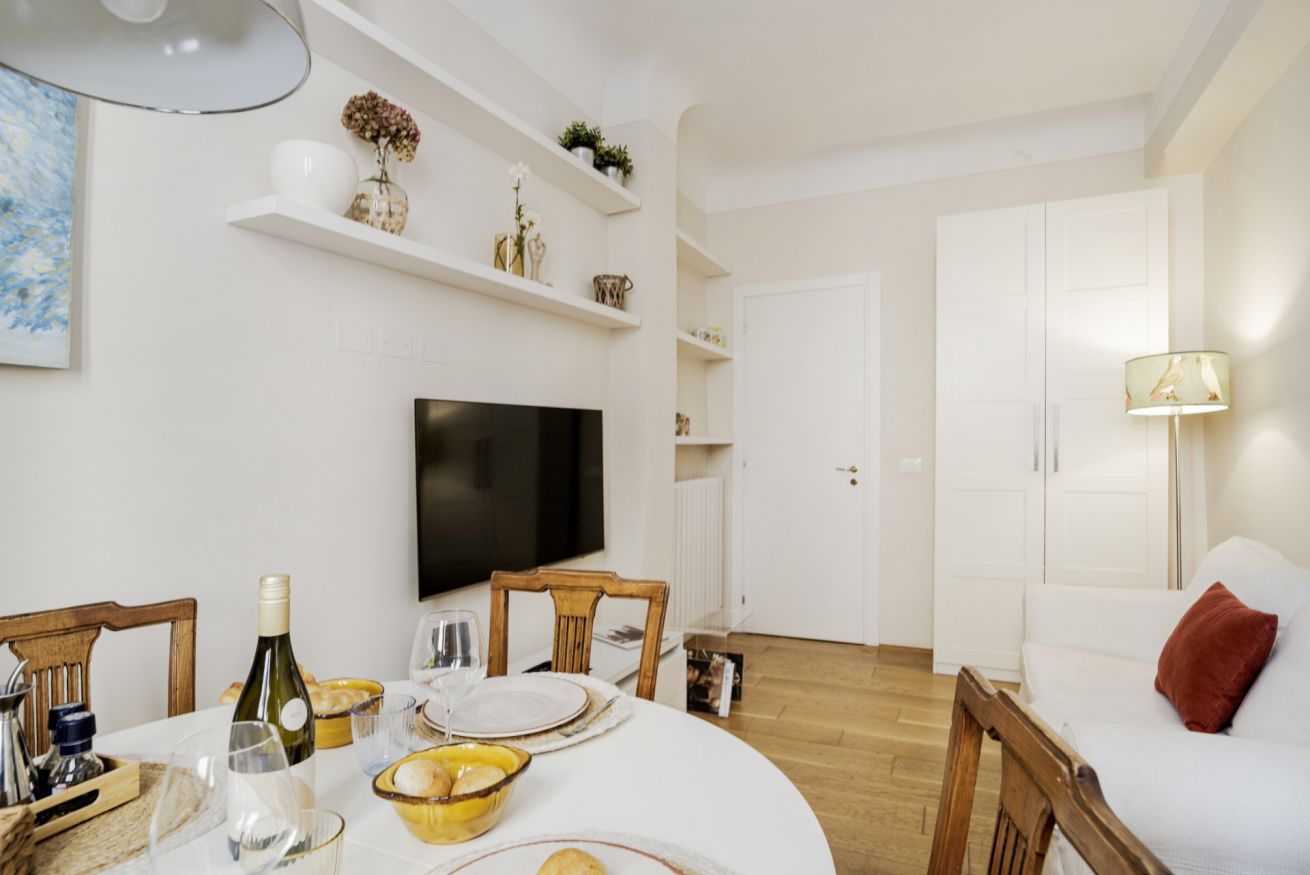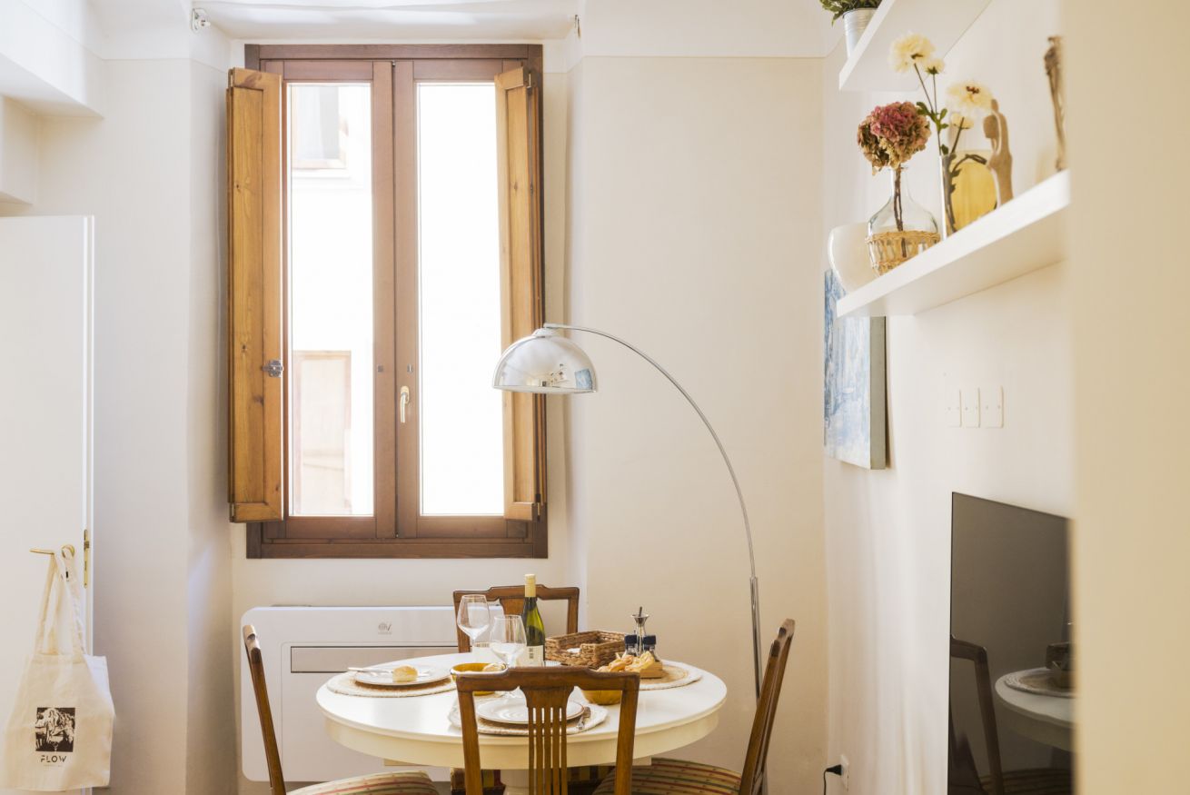 La casa si trova al primo piano, raggiungibile con circa 18 scalini, all’interno di un elegante palazzo storico. All’ingresso ti accoglie una cucina attrezzata con suggestive travi in legno a vista, collegata sia alla camera da letto sia al soggiorno. La camera dispone di bagno privato con antibagno dotato di lavandino e lavatrice, e una seconda zona con wc, bidet e doccia. Dal lato opposto, la cucina conduce al soggiorno con tavolo da pranzo, TV e un pratico ripostiglio. La casa è dotata di riscaldamento autonomo e aria condizionata in camera e soggiorno.