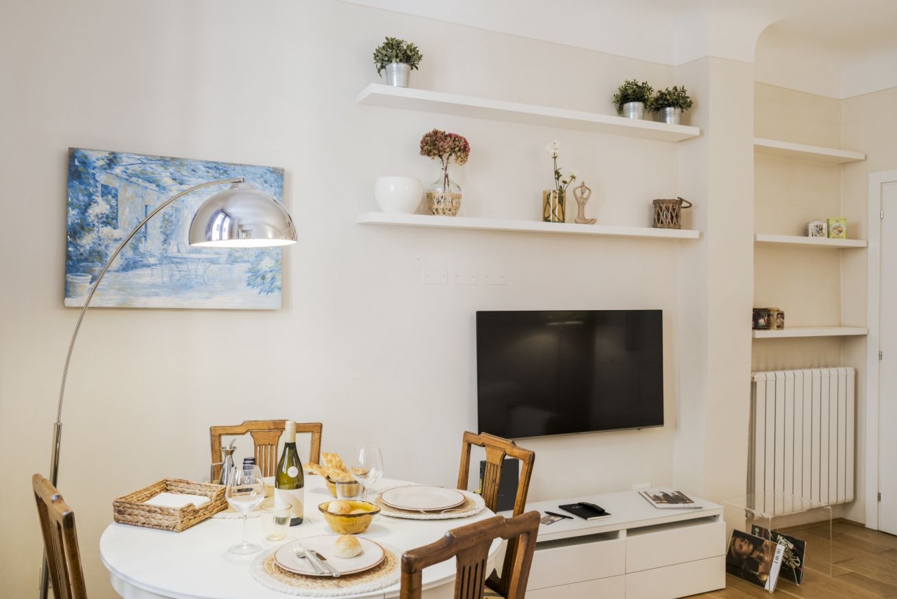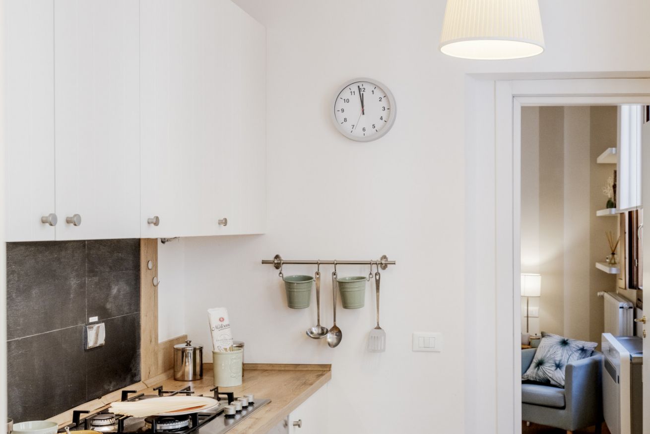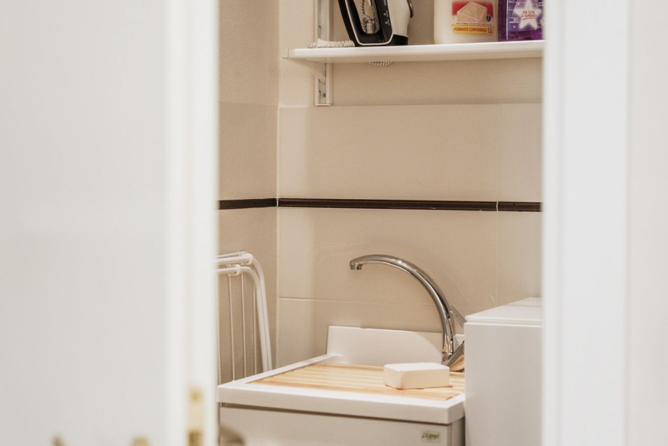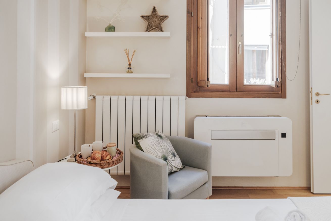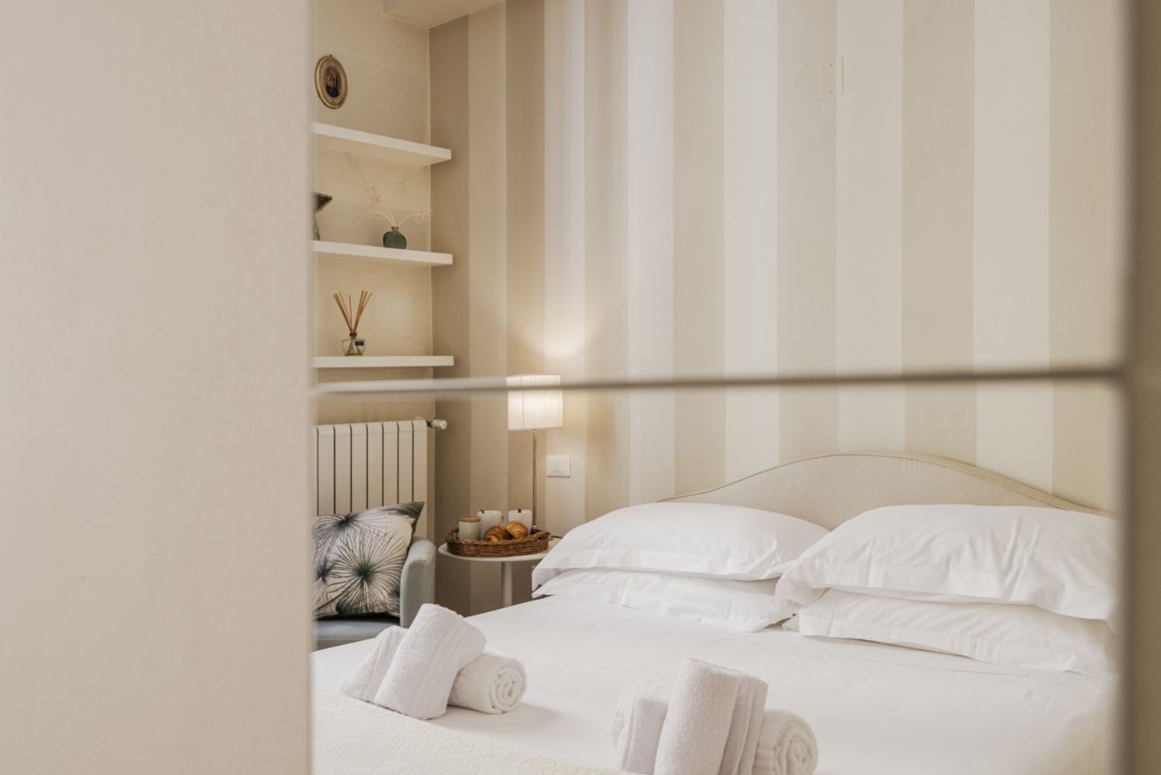 La casa si trova al primo piano, raggiungibile con circa 18 scalini, all’interno di un elegante palazzo storico. All’ingresso ti accoglie una cucina attrezzata con suggestive travi in legno a vista, collegata sia alla camera da letto sia al soggiorno. La camera dispone di bagno privato con antibagno dotato di lavandino e lavatrice, e una seconda zona con wc, bidet e doccia. Dal lato opposto, la cucina conduce al soggiorno con tavolo da pranzo, TV e un pratico ripostiglio. La casa è dotata di riscaldamento autonomo e aria condizionata in camera e soggiorno.