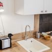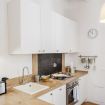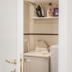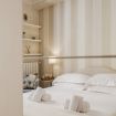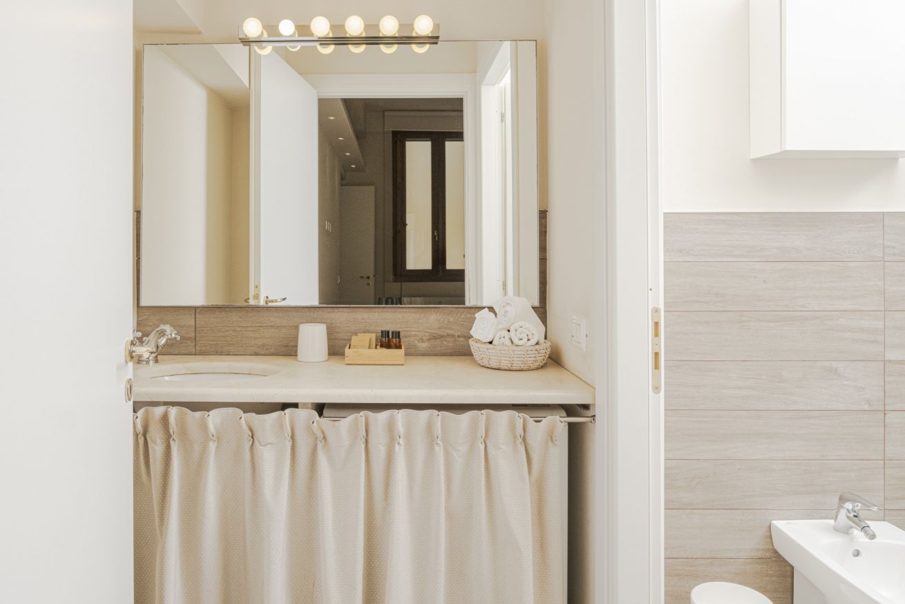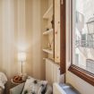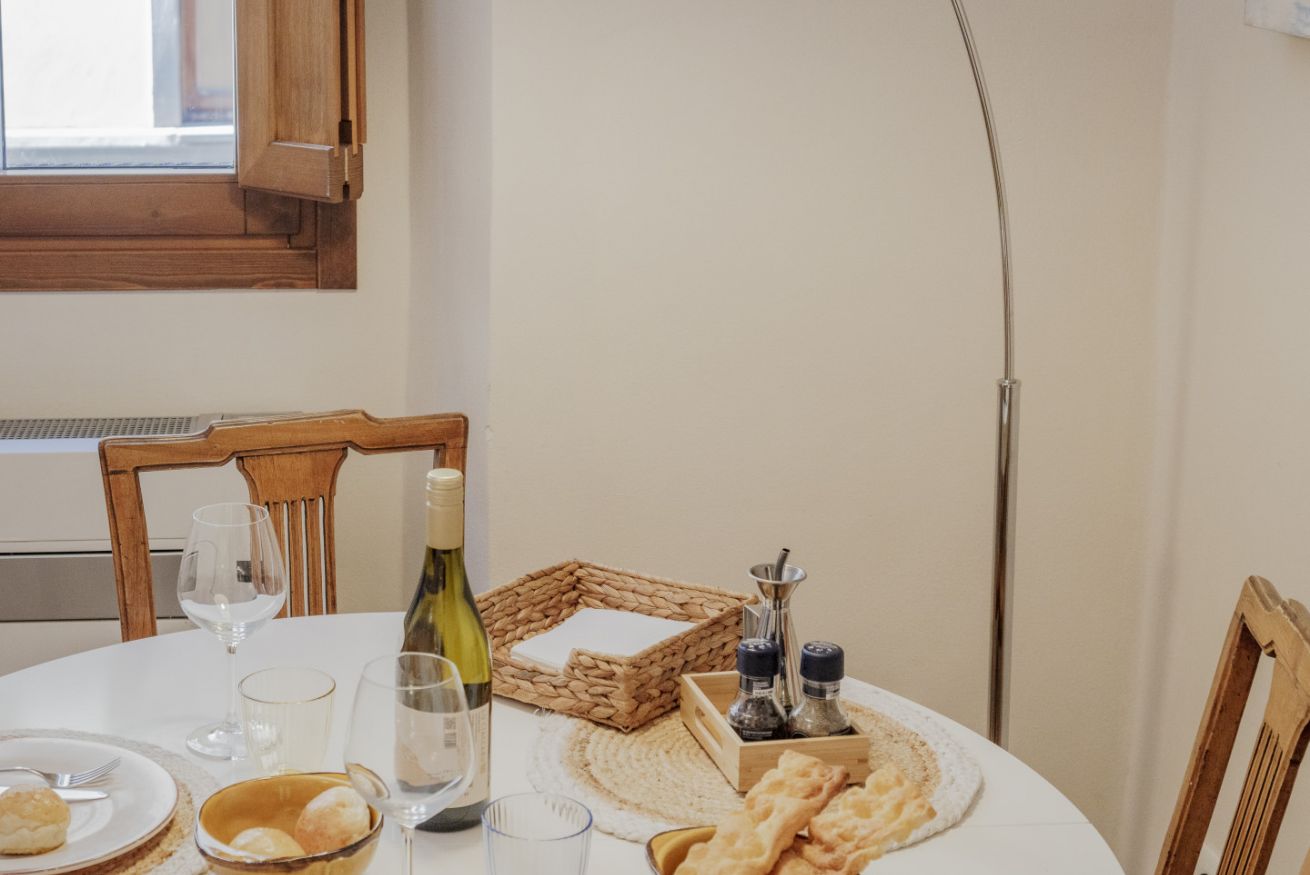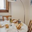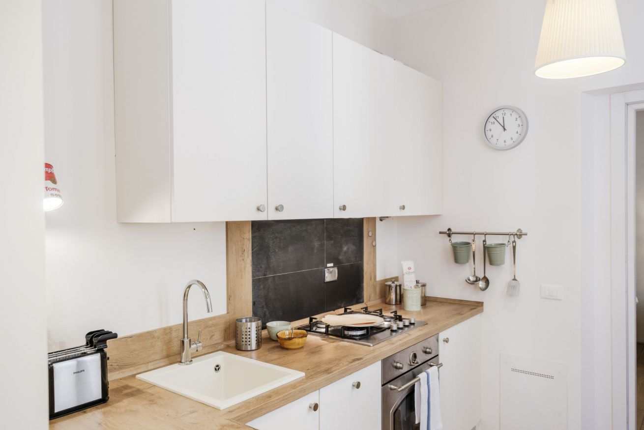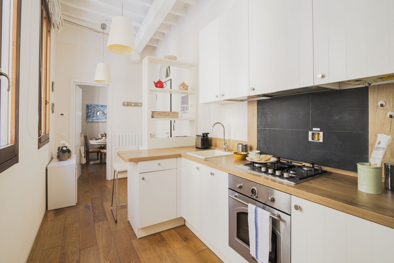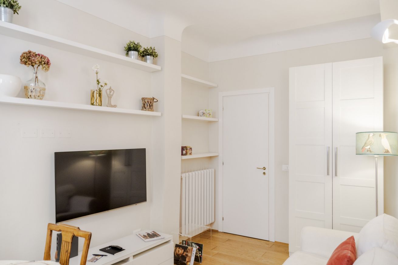 La casa si trova al primo piano, raggiungibile con circa 18 scalini, all’interno di un elegante palazzo storico. All’ingresso ti accoglie una cucina attrezzata con suggestive travi in legno a vista, collegata sia alla camera da letto sia al soggiorno. La camera dispone di bagno privato con antibagno dotato di lavandino e lavatrice, e una seconda zona con wc, bidet e doccia. Dal lato opposto, la cucina conduce al soggiorno con tavolo da pranzo, TV e un pratico ripostiglio. La casa è dotata di riscaldamento autonomo e aria condizionata in camera e soggiorno.