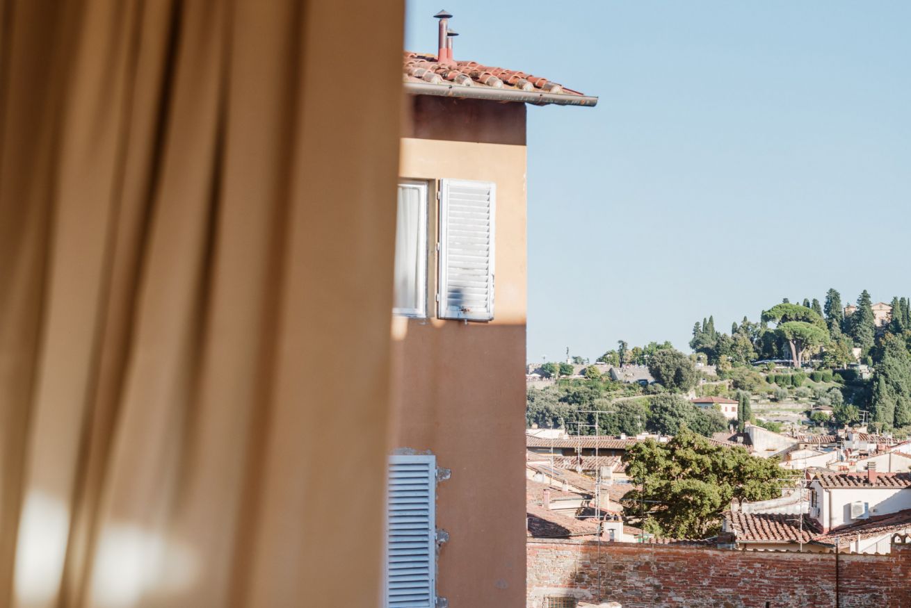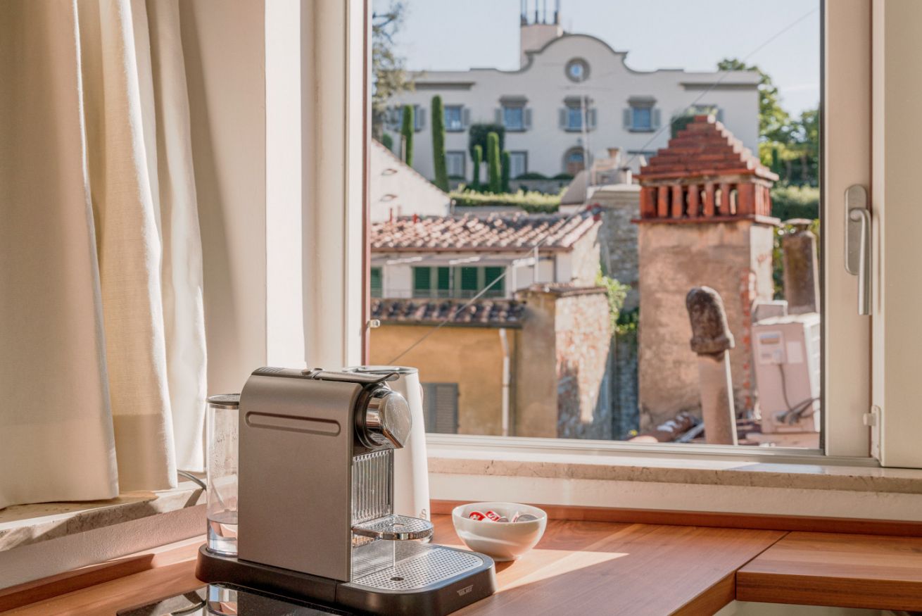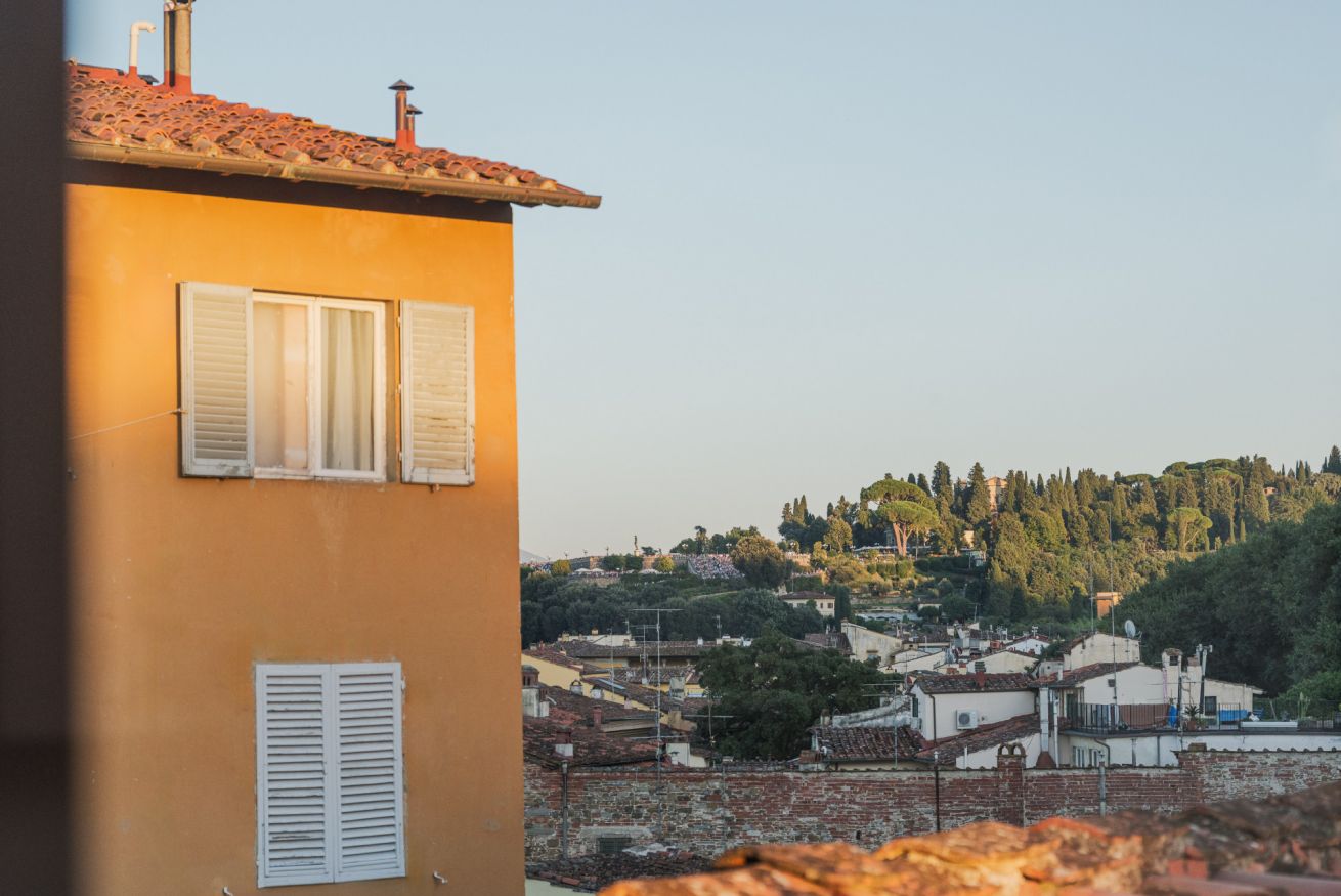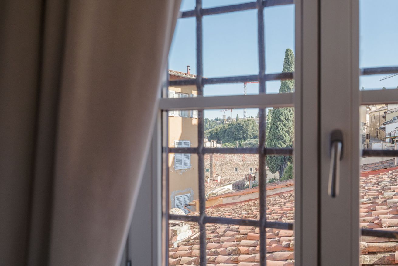 L’attico ospita comodamente fino a 3 persone e si sviluppa sopra i tetti di Firenze, offrendo una vista unica sulla città e sulle colline circostanti. Si trova in un elegante palazzo con servizio di portineria. All’ingresso dell’appartamento, alcuni scalini conducono all’ampia zona giorno, un open space che unisce cucina, soggiorno con TV e tavolo da pranzo in un ambiente rilassante e luminoso. Il living si apre con ampie vetrate a 180° sul centro storico di Firenze, regalando scorci spettacolari. Qui è disponibile, su richiesta, un divano letto singolo. Un bagno separa il living dalla camera matrimoniale, intima e luminosa, con affaccio sulle colline e su Piazzale Michelangelo. Sia la zona giorno che la camera sono dotate di aria condizionata e riscaldamento.